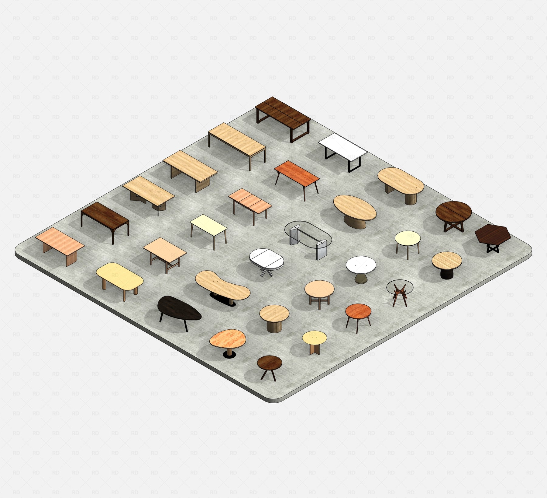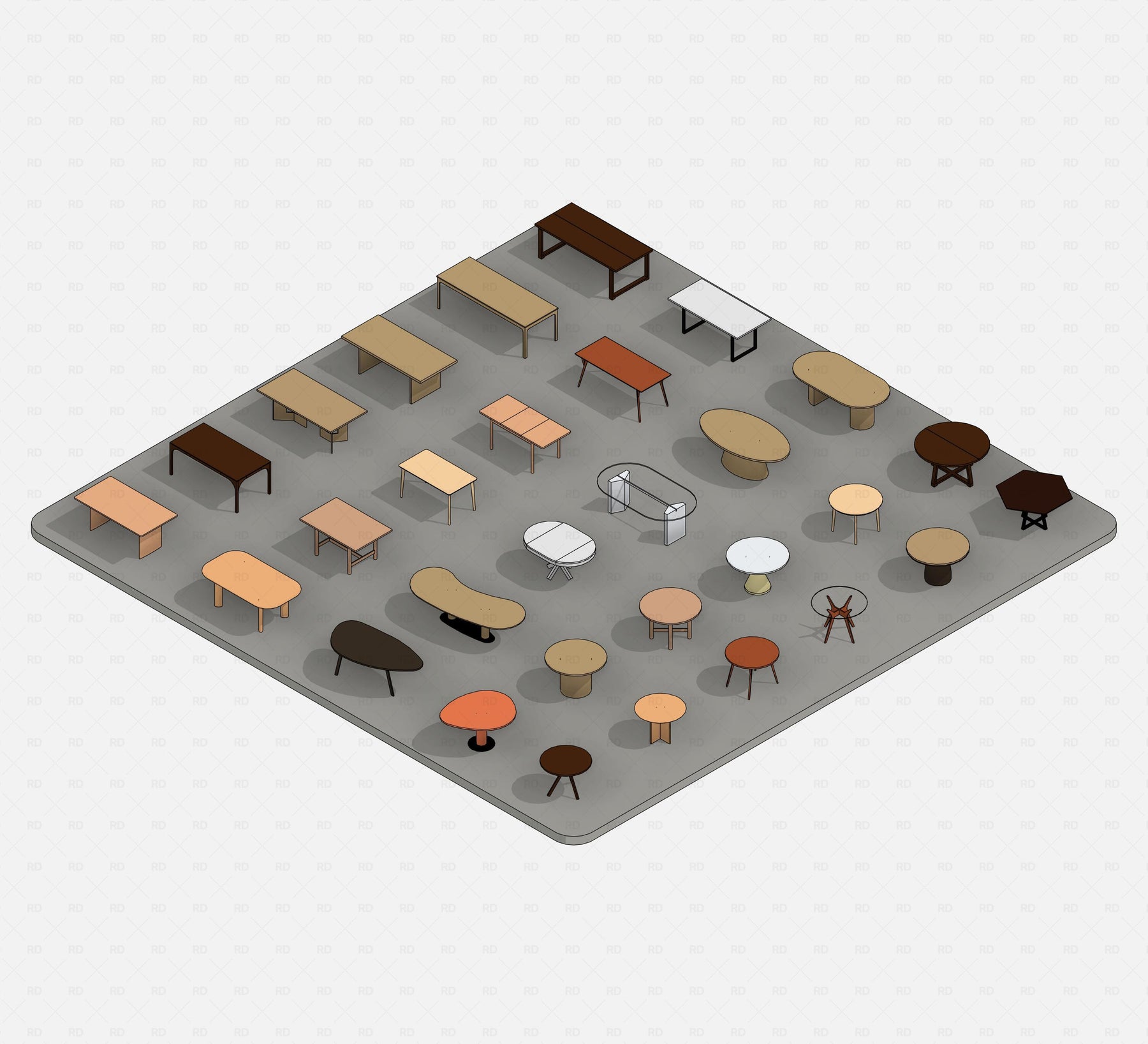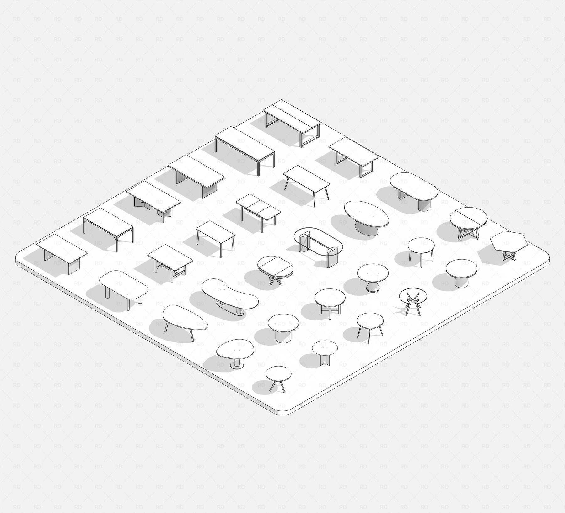 This Revit Dining Tables Pack includes 30 fully parametric families, offering a diverse range of forms — oval, rectangular, circular, hexagonal, organic, and more. All designed to suit residential, commercial, hospitality, and retail interiors.