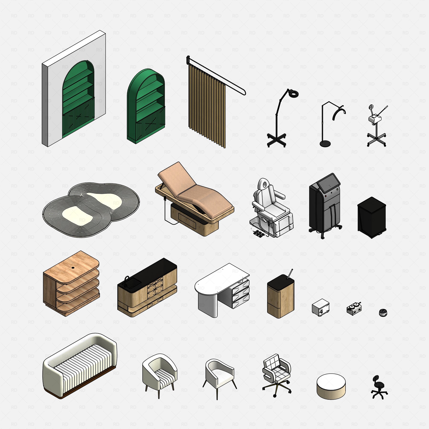 Download a pack of 26 stylish, fully parametric Revit Skin Care Salon furniture and equipment families. The collection includes essential treatment beds, skincare equipment, mirrors, storage, and decorative elements designed to help you quickly build realistic beauty and skincare clinic interiors.