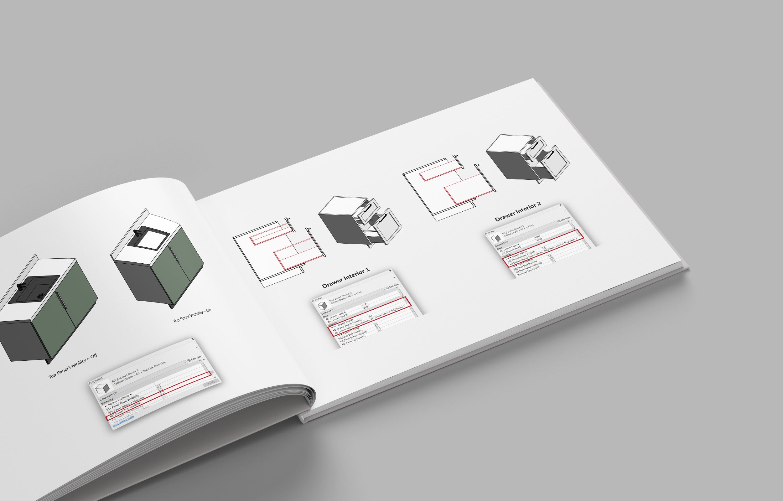 Each Cabinet Family includes a super parametric approach to create maximum design flexibility. Cabinets host multiple nested Families to make the design decisions immediate and easy to change.