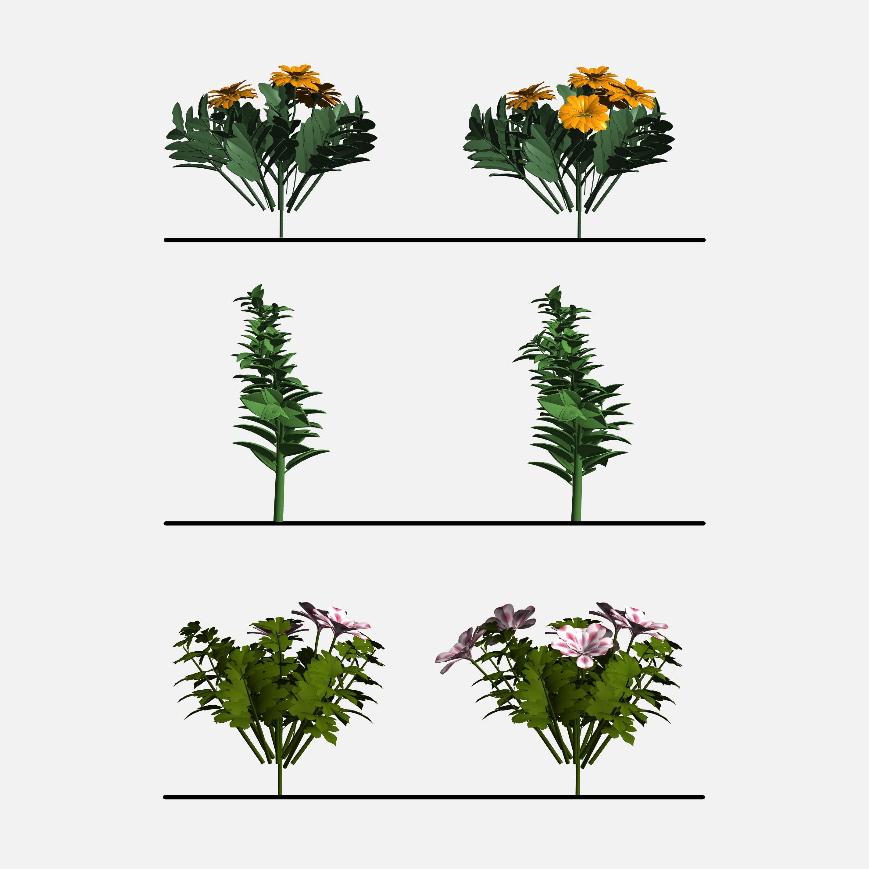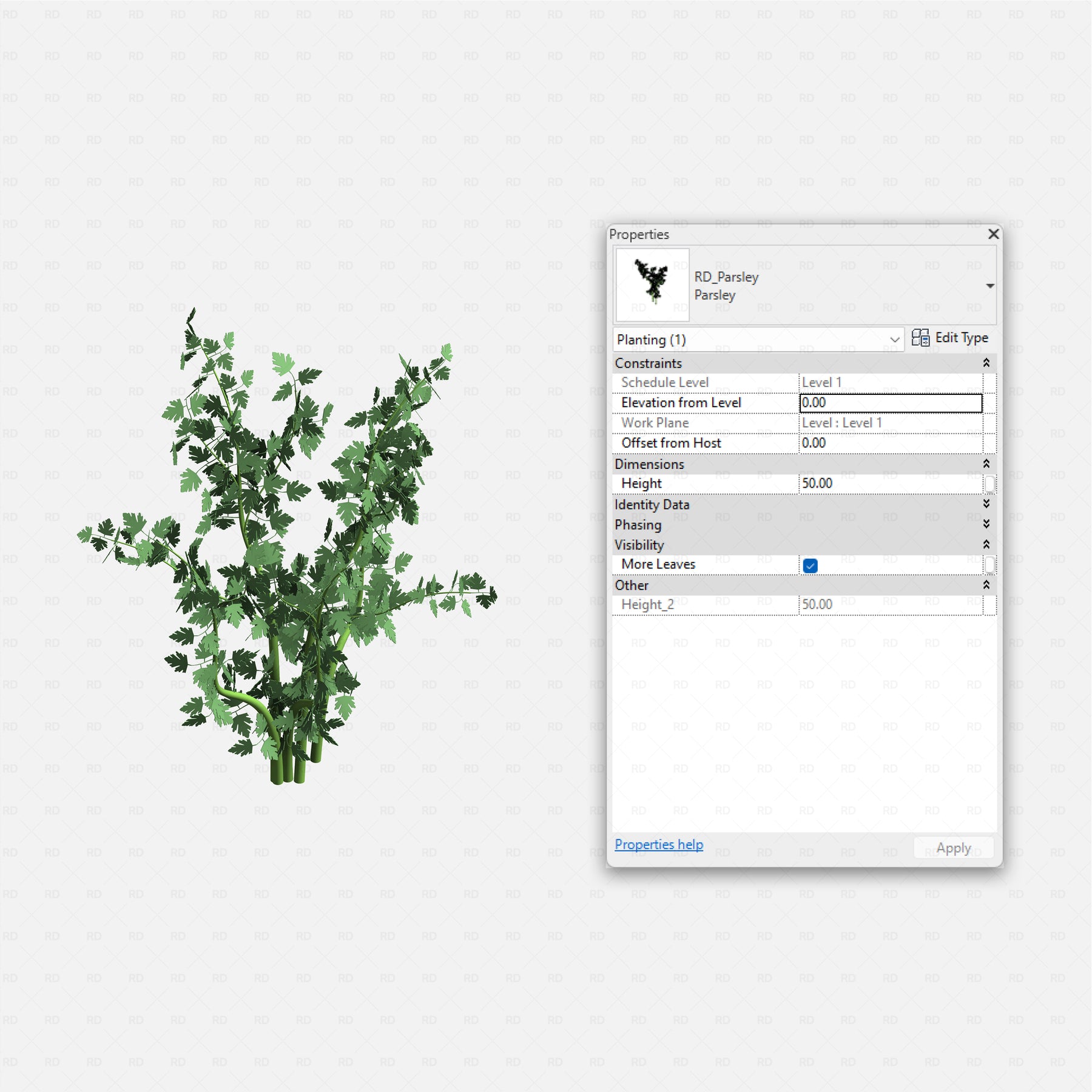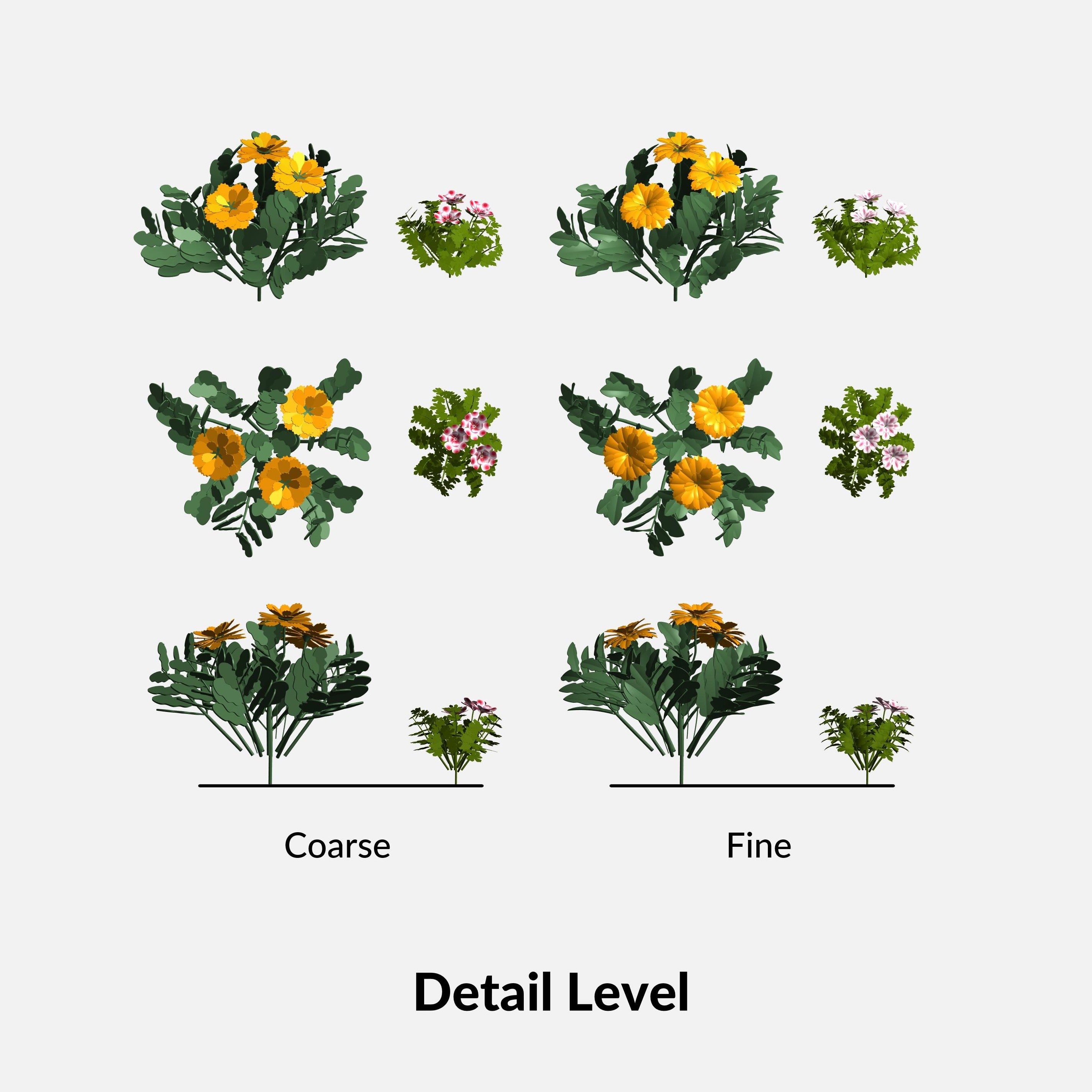 All families are scalable by height, allowing you to simulate different growth stages from seedlings to mature plants while maintaining proper geometry. Visibility controls let you toggle leaf density or fuller foliage, so one family can adapt to multiple planting densities and design intents.