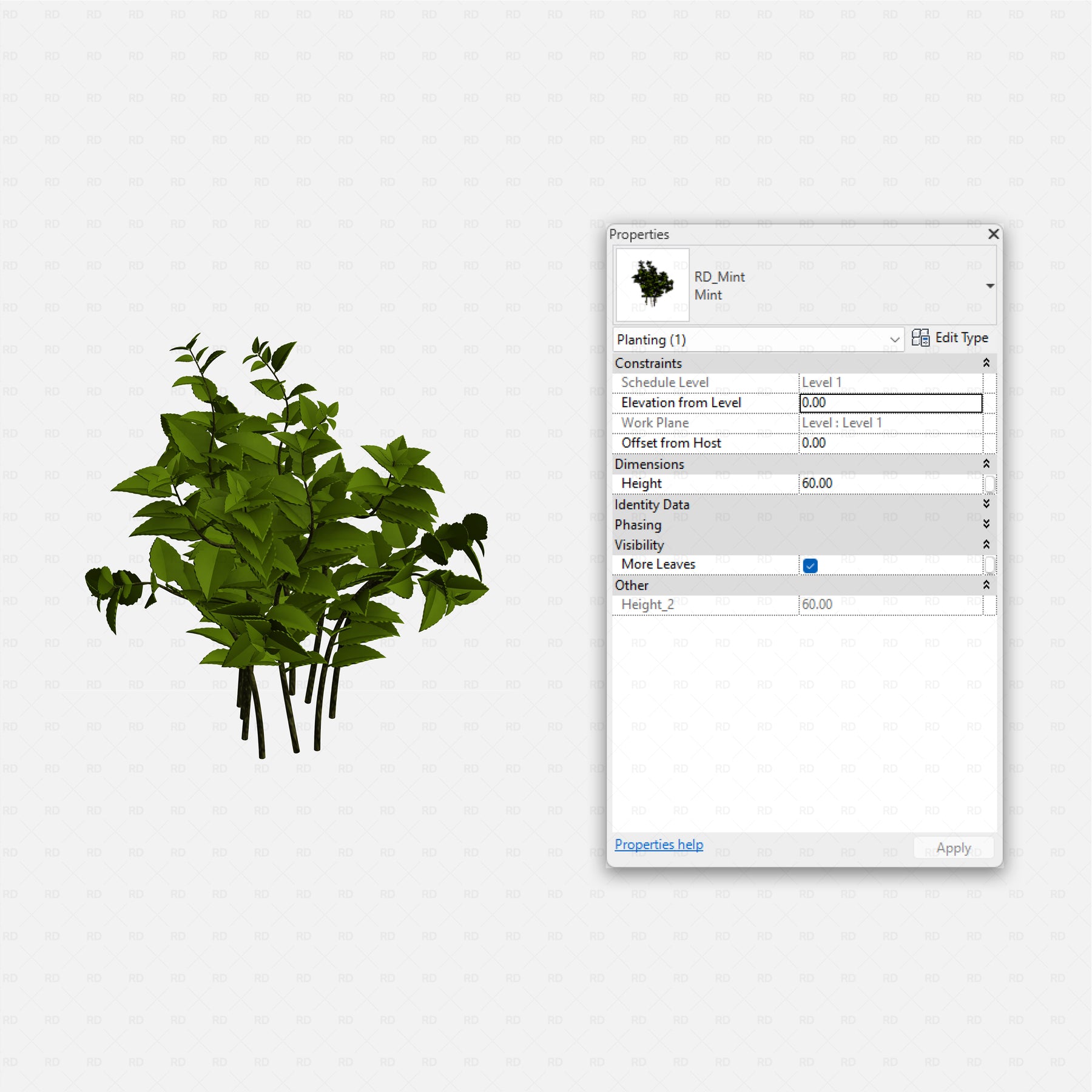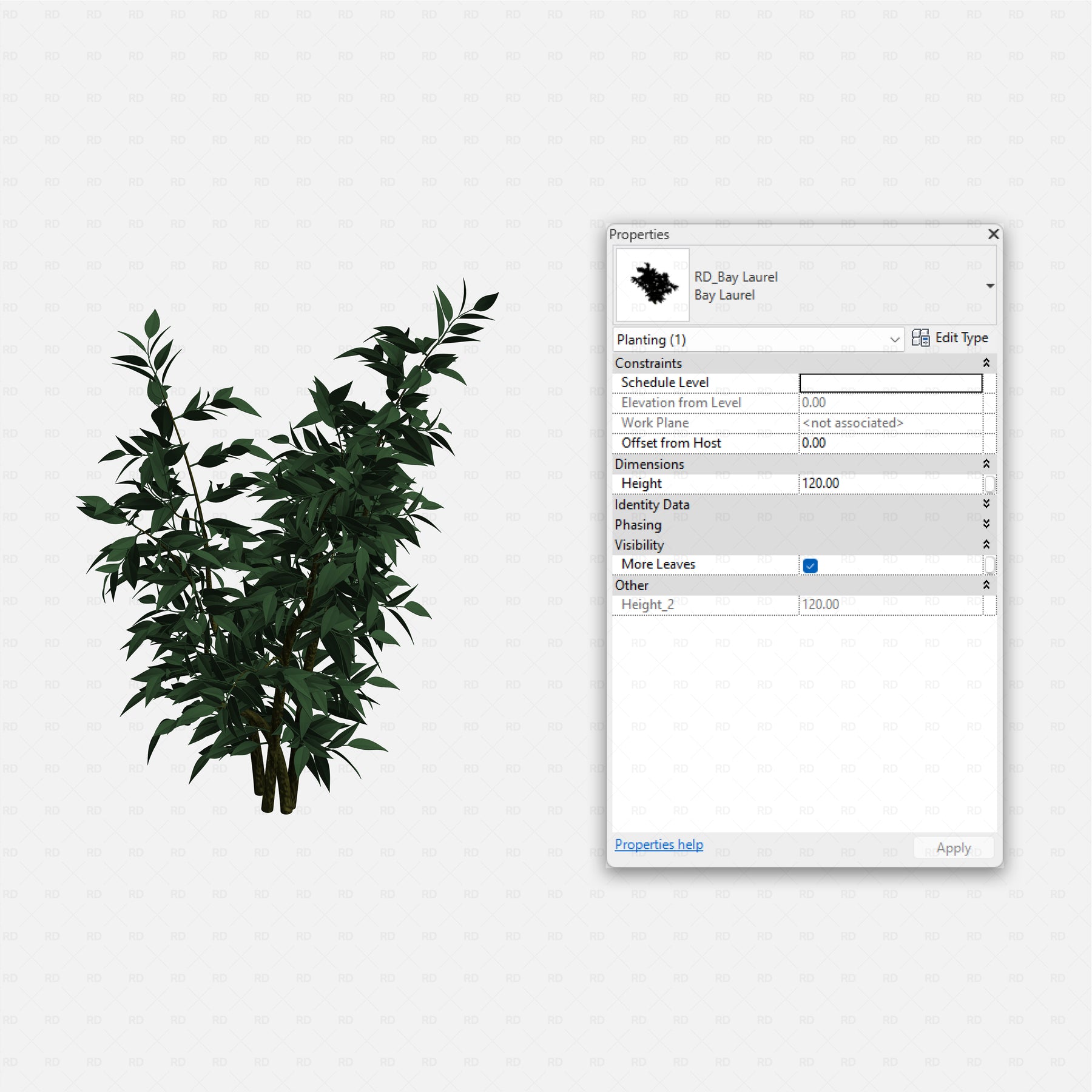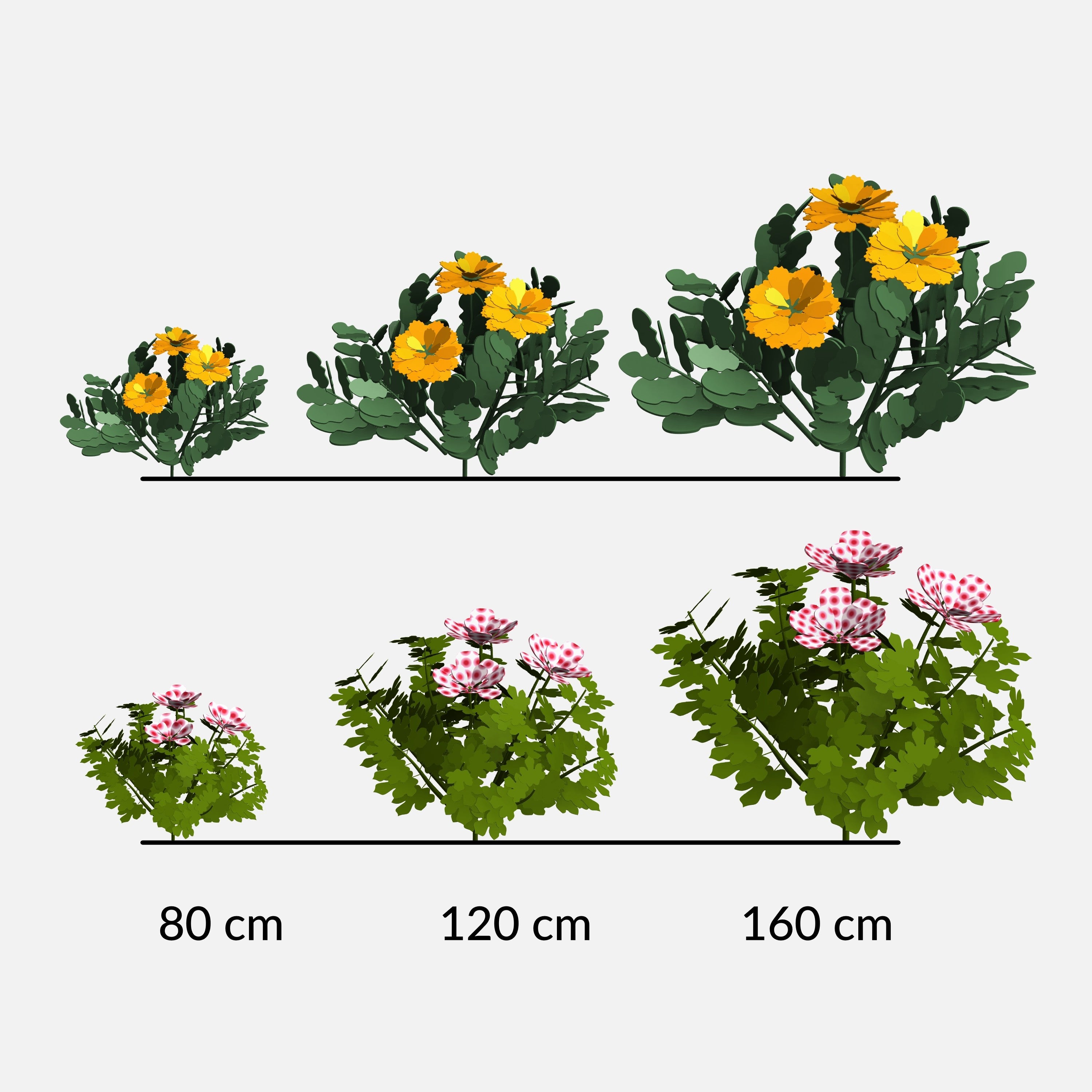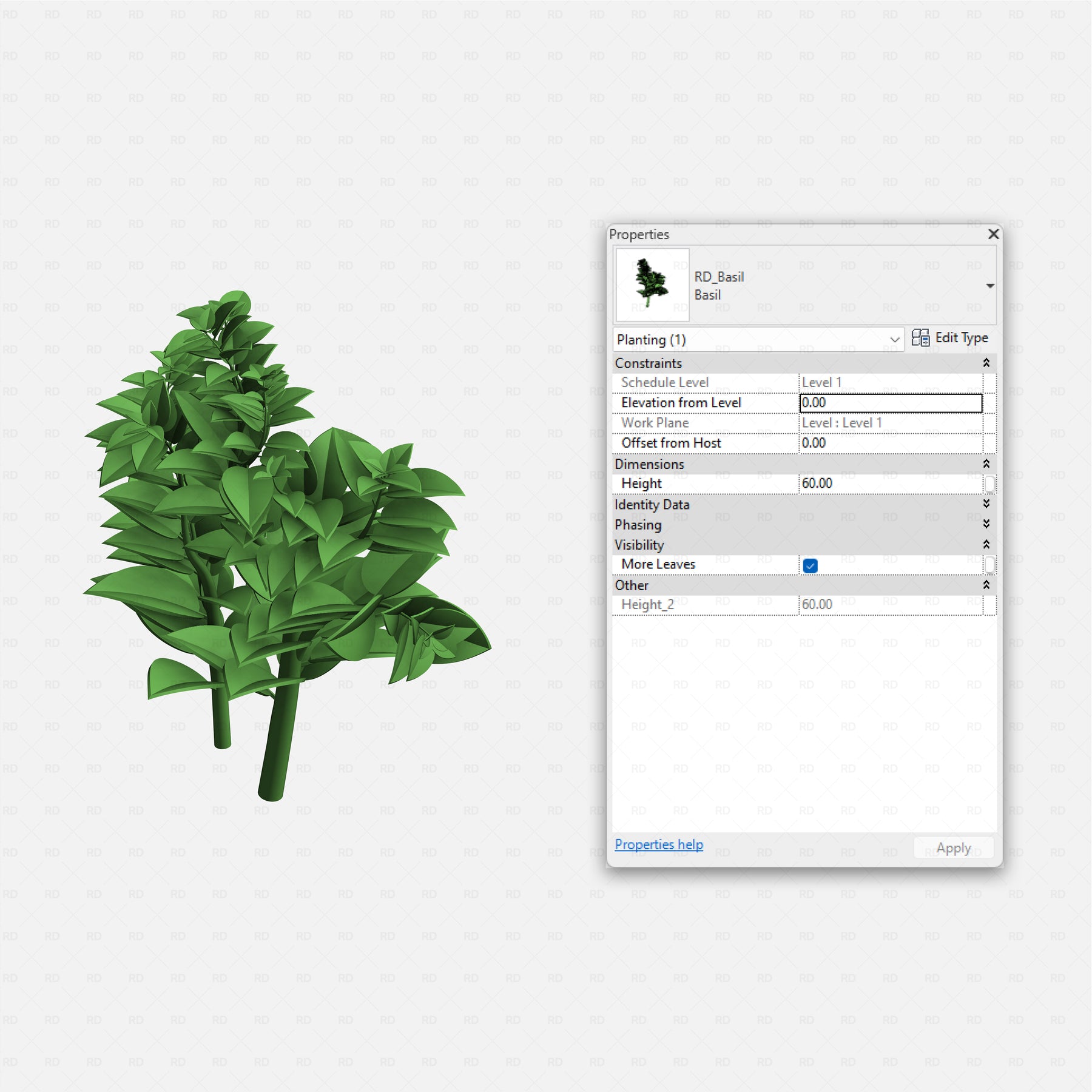 All families are scalable by height, allowing you to simulate different growth stages from seedlings to mature plants while maintaining proper geometry. Visibility controls let you toggle leaf density or fuller foliage, so one family can adapt to multiple planting densities and design intents.