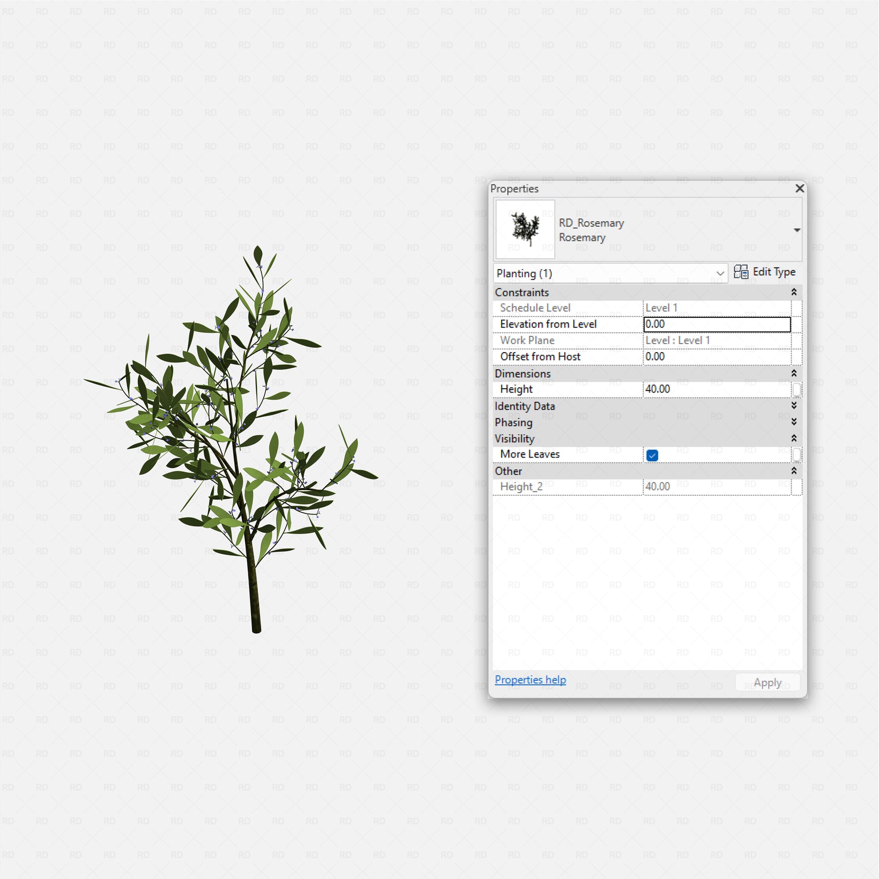 Instead of multiple families for each growth stage, a single parametric family adapts through height scaling and visibility controls. This allows designers to represent early growth, mature plants, or denser planting schemes using one clean, efficient Revit asset.