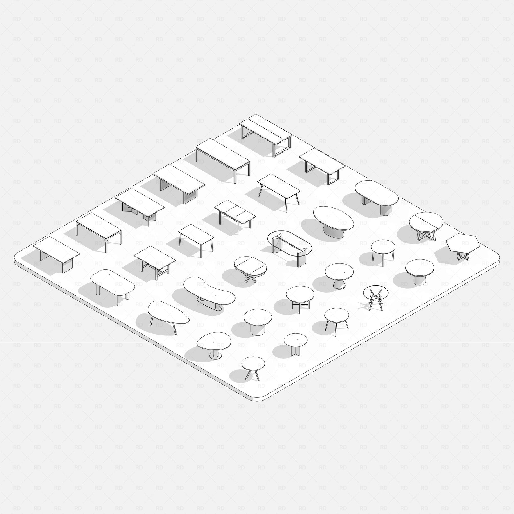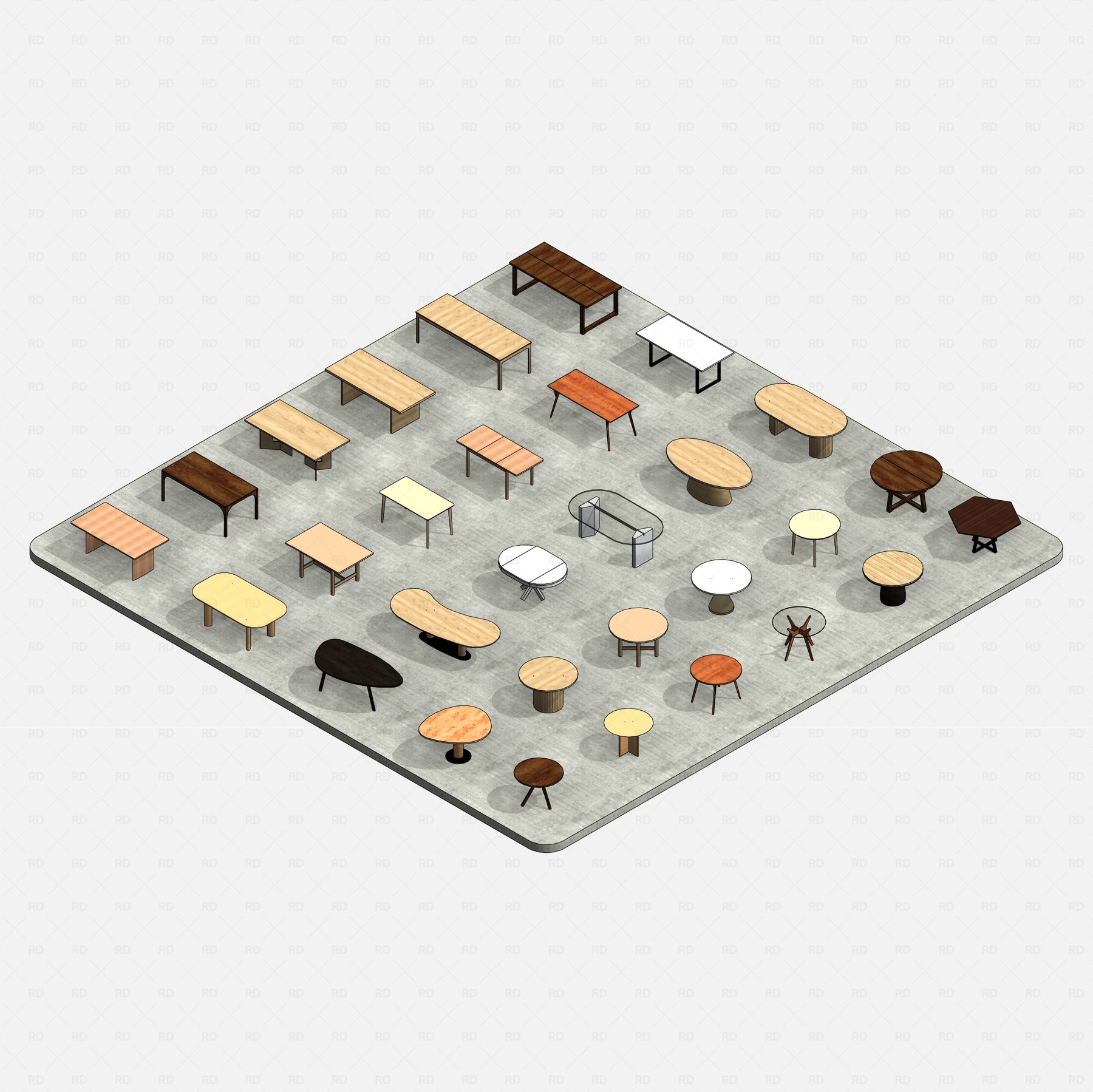 This Revit Dining Tables Pack includes 30 fully parametric families, offering a diverse range of forms — oval, rectangular, circular, hexagonal, organic, and more. All designed to suit residential, commercial, hospitality, and retail interiors.
