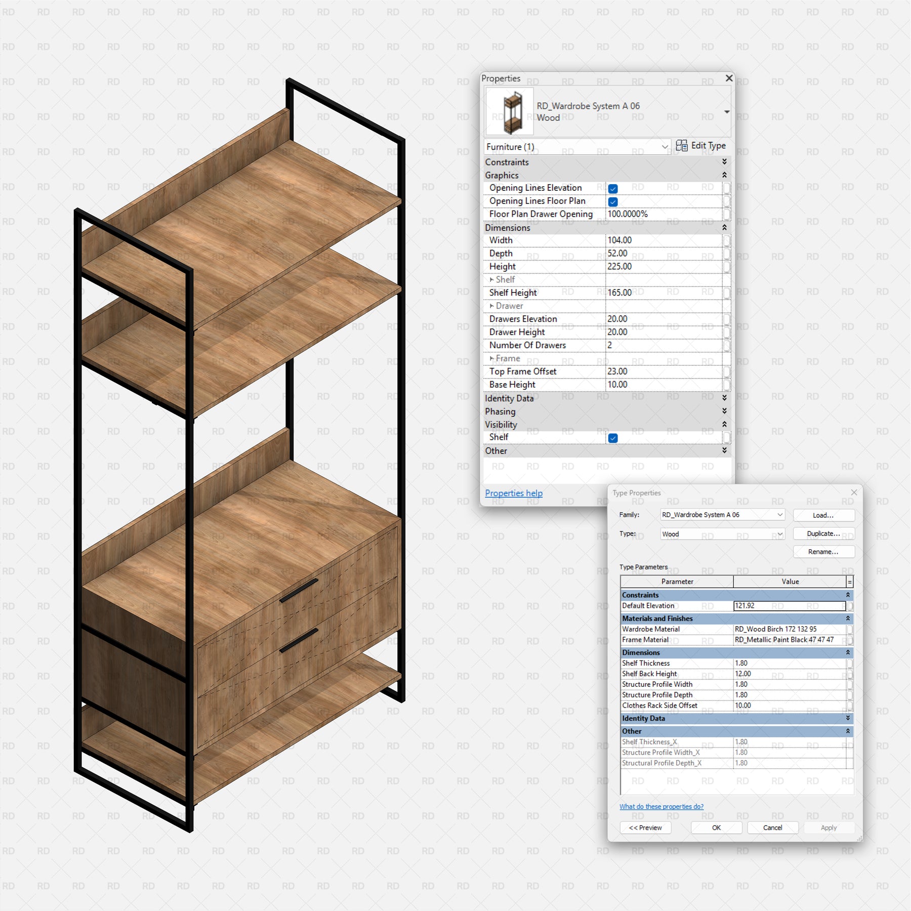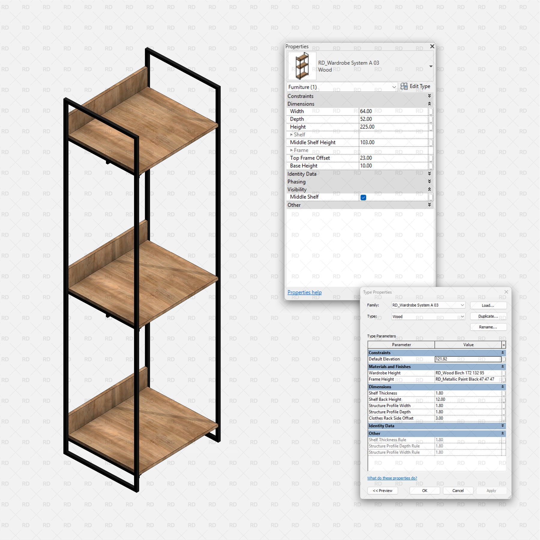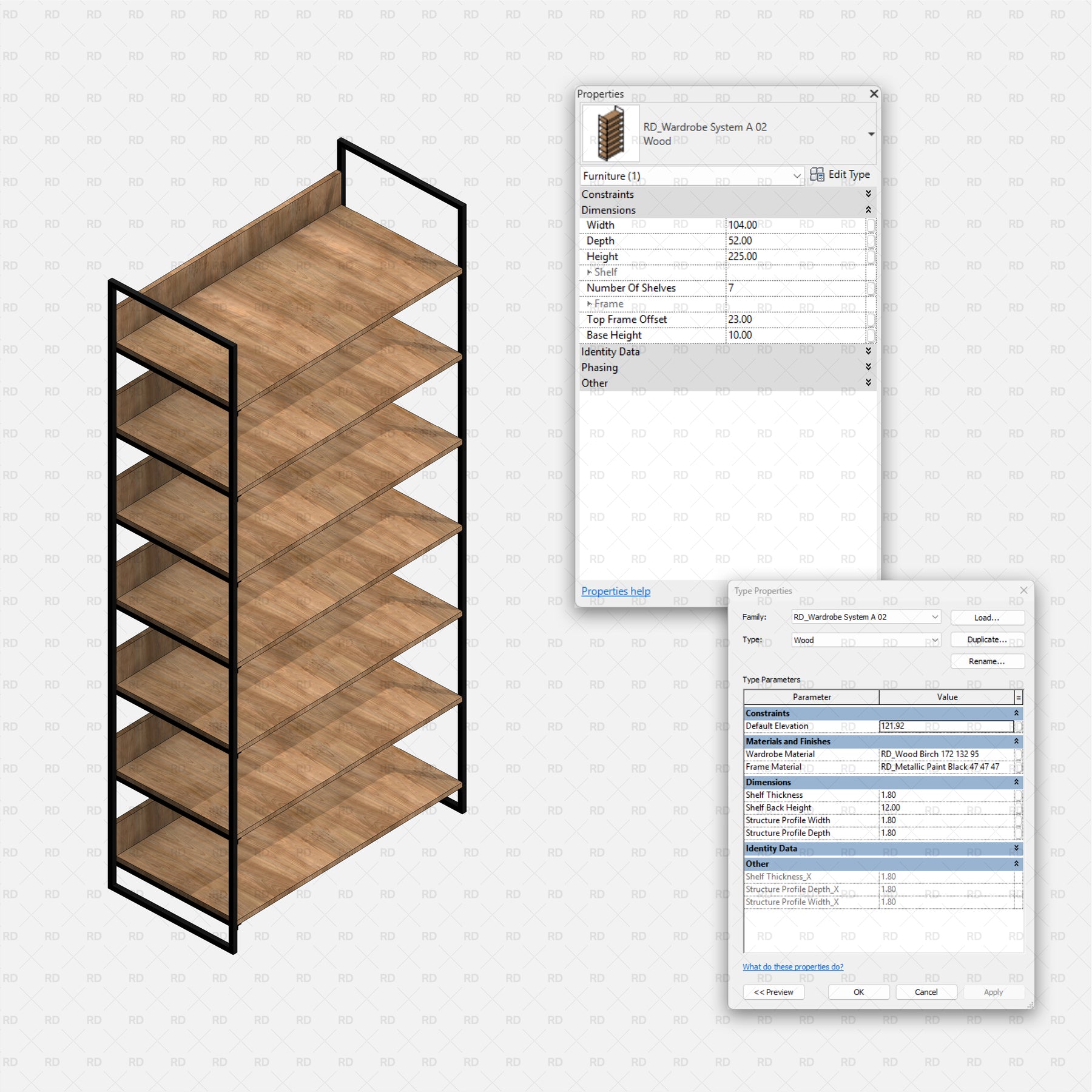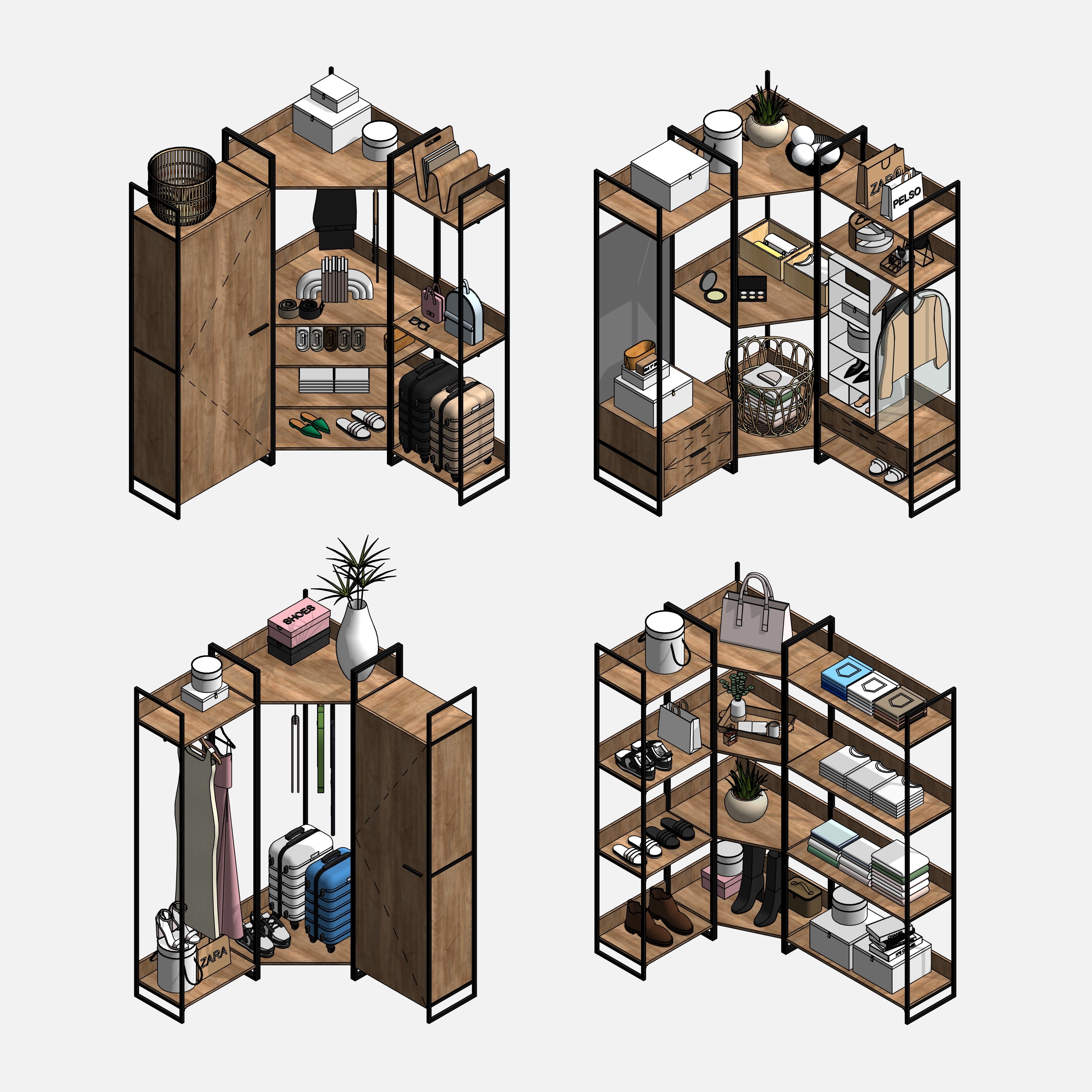 Each wardrobe family is built to be fully parametric, giving you complete control over dimensions, shelving layouts, and storage options. Easily adjust height, width, and depth, and open or close cabinet doors to match your design intent.