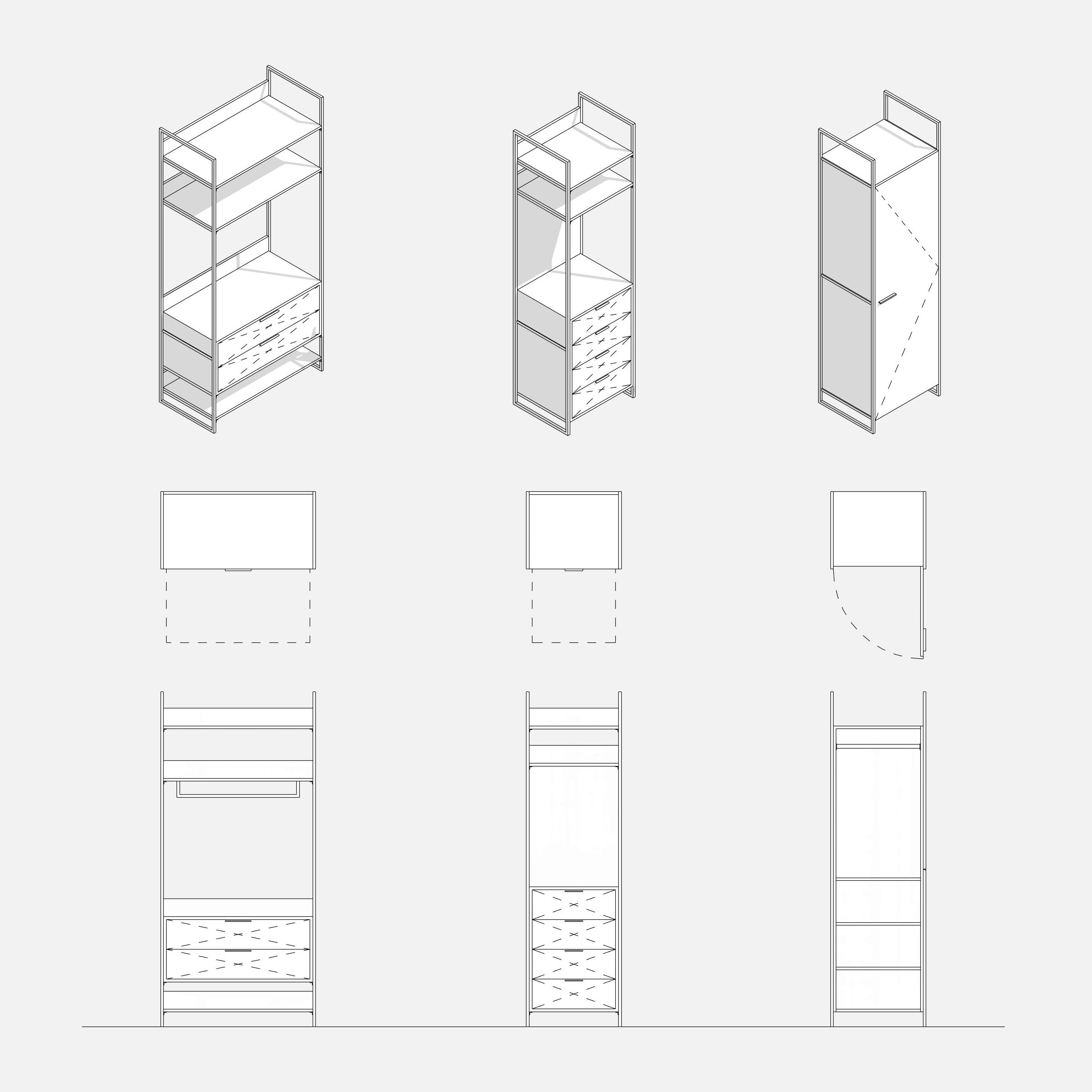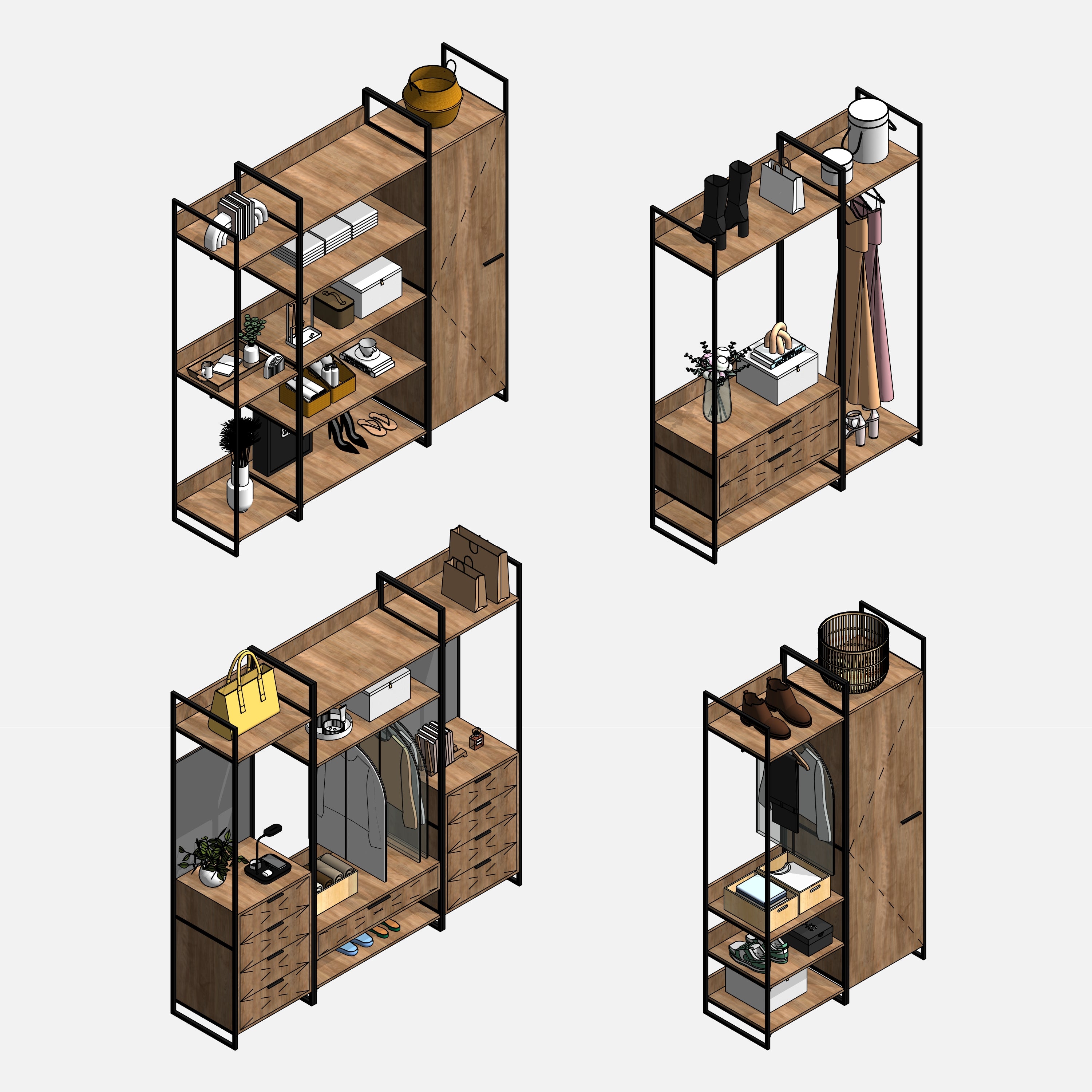 Each wardrobe family is built to be fully parametric, giving you complete control over dimensions, shelving layouts, and storage options. Easily adjust height, width, and depth, and open or close cabinet doors to match your design intent.